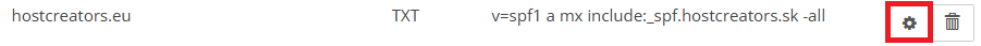• V zozname nájdete TXT záznam, ktorý má v stĺpci "hodnota" zadané: v=spf1 a mx include:_spf.hostcreators.sk -all