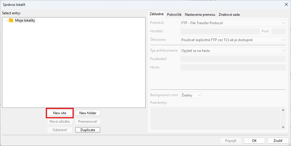 Vytvorenie novej FTP lokality